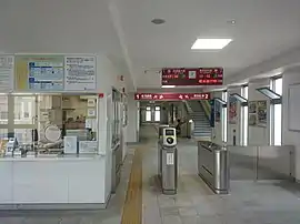 The station is an elevated station with dual opposed side platforms. It is staffed during daylight hours. The station building has automated ticket machines, and automated turnstiles which accept the NicePass smart card, as well as ET Card, a magnetic card ticketing system.