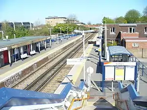 ![]() Left: Sunbury railway station, car park, apartments and BT workshop. Right: Information board, passenger shelter and 1960s cuboid, tile-hung semi-detached houses. | |