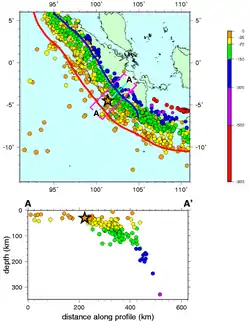 At this plate boundary, earthquakes occur along the Sunda megathrust and within both the subducting and overriding plates. The largest earthquakes are generated when the megathrust itself ruptures. Studies of both recent and historical earthquakes show that the megathrust is segmented.[1] The largest earthquakes occur on separate 'patches' along the megathrust surface (1797, 1833, 1861, 2004, 2005 & 2007), with smaller events occurring at the boundaries between these patches (1935, 1984, 2000 & 2002).[1] The rupture area of the 1861 event appears to be very similar to that for the 2005 event, suggesting that it can be regarded as a repeat event. The 2007 event is interpreted to be a partial failure of the rupture area of the 1833 event.[1]