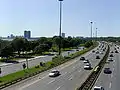 At the same time, other roadways were built or expanded, including the new Queensway, with a dedicated streetcar right-of-way to the north, using some of the High Park lands on the north side of the railway right-of-way. The Lake Shore Boulevard was doubled in width to six lanes and redesigned into a 'scenic drive' style with the two directions separated by a grassy boulevard with no facilities for pedestrians. Today, a majority of the lands are given over to transportation uses.