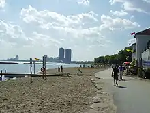 In 2012, the City of Toronto water department proposed using landfill from soil excavated during the construction of the Eglinton Crosstown LRT to construct a chain of artificial islands near the mouth of the Humber River to divert its flow away from the beach.[13][14][15][16] Heavy rains can flush pollutants down the river, temporarily making the beaches near its mouth unsafe for swimming. The proposed Humber Islands would extend approximately one kilometre off shore, and would be connected by an underwater berm, directing the river's flow into deep water.