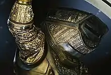 The gold-leaf shielding in Sunshine was influenced by NASA satellite designs for deflecting heat and other forms of radiant energy. Boyle designed the gold-coloured space suits along these lines despite persistent encouragement to model them after the NASA template. The helmets were designed to have cameras mounted in them. This further enhanced a sense of claustrophobia useful to the actors in delivering more heartfelt performances.[32] The helmets were also limited to a horizontal slit for visibility instead of a full-face visor as further consideration toward protecting the characters from the ambient radiation of outer space.[40] According to Boyle, the funnel shape of the helmet was influenced by the character Kenny from South Park.[32]