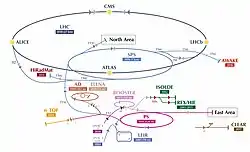The Super Proton Synchrotron (SPS) is a particle accelerator of the synchrotron type at CERN. It is housed in a circular tunnel, 6.9 kilometres (4.3 mi) in circumference,[1] straddling the border of France and Switzerland near Geneva, Switzerland.[2]