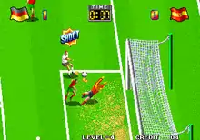 Super Sidekicks is a soccer game that is played from a top-down perspective in a two-dimensional environment with sprites. Although it follows the same gameplay as with other soccer titles at the time and most of the rules are present as well, the game opts for a more arcade-styled approach of the sport instead of being full simulation, using a simplified control scheme.[1] The tile features 12 teams divided into two groups which compete for the "SNK Cup": Group A (Germany, Italy, Spain, England, Mexico, Japan) and Group B (Argentina, Holland, Brazil, France, United States, South Korea).[1][2]