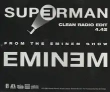 "Superman" is a song by American rapper Eminem from his fourth studio album, The Eminem Show (2002), featuring guest vocals from Eminem's frequent collaborator, singer Dina Rae. Written by Eminem, Jeff Bass and Steve King, the song was released as the third single from The Eminem Show on January 27, 2003 in the United States only. It peaked at number 15 on the Billboard Hot 100 chart on the issue dated March 15, 2003 and received a Platinum certification by the Recording Industry Association of America (RIAA).
