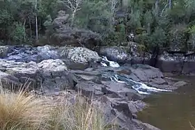 The river rises below Kellys Lookout within the Mount Careless Forest Reserve, southwest of Beaconsfield and west of Exeter. The river flows generally east-northeast, joined by two minor tributaries before reaching its confluence with the Tamar River at Robigana. From this point, the river enters Bass Strait. The river descends 416 metres (1,365 ft) over its 27-kilometre (17 mi) course.[1] The river is transversed by the West Tamar Highway.