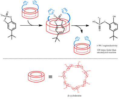 From the early 1970s, cyclodextrins have been extensively studied for its encapsulation properties and used as binding sites in supramolecular catalyst.[2] Cyclodextrins have rigid ring structure, hydrophilic surface, and hydrophobic cavity on the inside; therefore, they are capable of binding organic molecules in aqueous solution. In 1978, with the background knowledge that the hydrolysis of m-tert-butylphenyl acetate is accelerated in the presence of 2-benzimidazoleacetic acid and alpha-cyclodextrin,[9] Brewslow et al. developed a catalyst based on a beta-cyclodextrin carrying two imidazole groups. This cyclodextrin catalytic system mimics ribonuclease A by its use of a neutral imidazole and an imidazolium cation to selective cleave cyclic phosphate substrates. The rate of the reaction is catalyzed 120 times faster, and unlike a hydrolysis by simple base NaOH that gives a 1:1 mixture of the products, this catalysts yield a 99:1 selectivity for one compound.[5]