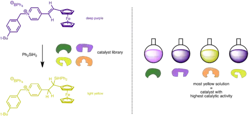 A problem with transition state analogue selection approach is that catalytic activity is not a screening criterion. TSAs do not necessarily represent real transition states and so a catalyst obtained from screening could just be the best receptor for a TSA but is not necessarily the best catalyst. To circumvent this problem, catalytic activity needs to be measured directly and also quickly. To develop a high-throughput screen, substrates could be designed to change color or release a fluorescent product upon reaction. For example, Crabtree and coworkers utilized this method in screening for a hydrosylation catalysts for alkene and imine.[23] Unfortunately the prerequisite for such substrates narrow down the range of reactions for study.[20]