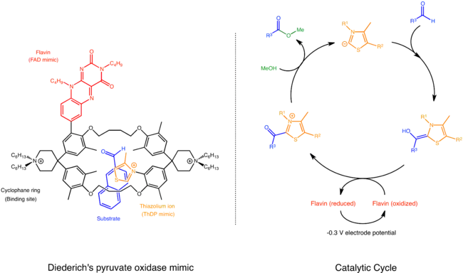 Diederich and coworkers mimicked this system with a supramolecular catalyst based on cyclophane. The catalyst has thiazolium ion, a reactive part of ThDP and flavin, a bare-bones core of FAD, in close proximity and near the substrate binding site. The catalytic cycle is almost the same as that in nature, except the substrate is an aromatic aldehyde rather than pyruvate. First, the catalyst binds the substrate within its cyclophane ring. Then, it uses thiazolium ion to condense with the substrate generating an active aldehyde. This aldehyde is oxidized by flavin and then attacked by methanol to yield a methyl ester.[25]