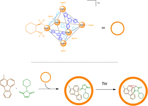 Fujita and coworkers discovered a self-assemble M6L4 (6 palladium ions and 4 ligands in each complex) supramolecular container that could be enhanced into a chiral supramolecule by an addition of peripheral chiral auxiliary. In this case, the auxiliary diethyldiaminocyclohexane does not directly activate the catalytic site but induces a slight deformation of the triazine plane to create chiral cavity inside the container molecule. This container could then be used to asymmetrically catalyze a [2+2] photoaddition of maleimide and inert aromatic compound fluoranthene, which previously have not been shown to undergo thermal or photochemical pericyclic reaction. The catalyst yields an enantiomeric excess of 40%.[27]
