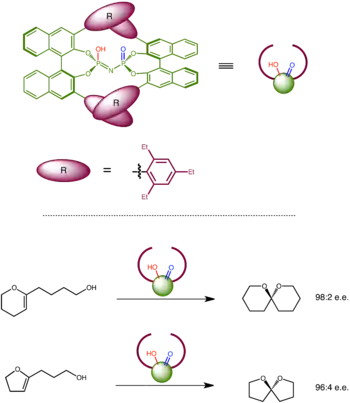 Inspired by enzymes with deep active site pocket, List and coworkers designed and constructed a set of confined Bronsted acids with an extremely sterically demanding chiral pocket based on a C2-symmetric bis(binapthyl) imidodiphosphoric acid. Within the chiral microenvironment, the catalysts has a geometrically fixed bifunctional active site that activates both an electrophilic part and a nucleophilic part of a substrate. This catalyst enables stereoselective spiroacetal formation with high enantiomeric excess for a variety of substrates.[28]