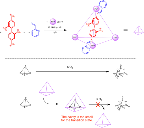 Nitschke and coworkers invented a self-assembly M4L6 supramolecular host with a tetrahedral hydrophobic cavity that can encapsulate white phosphorus. Pyrophoric phosphorus, which could self-combust upon contact with air, is rendered air-stable within the cavity. Even though the hole in the cavity is large enough for an oxygen molecule to enter, the transition state of the combustion is too large to fit within the small cage cavity.[29]
