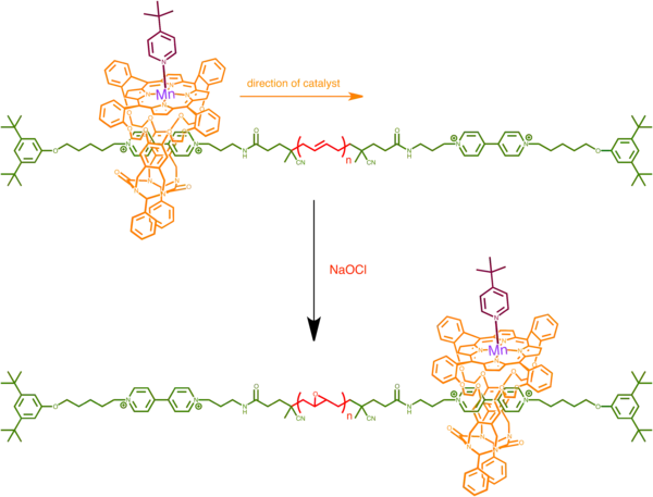 Nolte and coworkers developed an artificial processive enzyme in a form of manganese porphyrin rotaxane that treads along a long polymer of alkene and catalyze multiple rounds of alkene epoxidation. Manganese (III) ion in the porphyrin is the molecule's catalytic center, capable of epoxidation in the presence of an oxygen donor and an activating ligand. With a small ligand such pyridine that binds manganese from inside the cavity of the rotaxane, epoxidation happens outside the catalyst. With a large bulky ligand such as tert-butyl pyridine that does not fit inside the cavity however, epoxidation happens on the inside of the catalyst.[26]