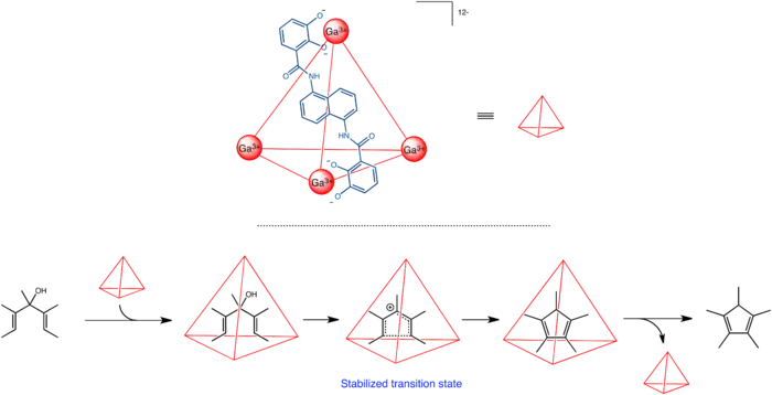 Raymond and coworkers developed a supramolecular host M4L6 (4 gallium ions and 6 ligands for each complex) that self-assembles via metal-ligand interaction in aqueous solution. This container molecule is polyanionic and thus its tetrahedron-shaped cavity is capable of encapsulating and stabilizing a cationic molecule. Consequently, encapsulated molecule can be easily protonated as a resulting carbocation from protonation is stabilized by the surrounding anions. Raymond utilized this property to perform acid-catalyzed Nazarov cyclization. The catalyst accelerates the reaction by over one million fold, making it the most efficient supramolecular catalyst to date. It was proposed that such a high catalytic activity does not arise just from the increased basicity of the encapsulated substrate but also from the constrictive binding that stabilize the transition state of the cyclization. Unfortunately, this catalyst has a problem with product inhibition. To by pass that problem, the product of the cyclization reaction could be reacted with a dienophile transforming it into a Diels-Alder adduct that no longer fits inside the catalyst cavity.[1]