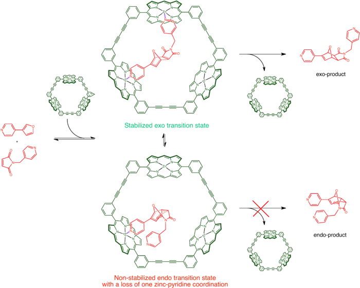 An example of catalysts of this type is Sander's porphyrin trimer. A Diels Alder reaction between two pyridine functionalized substrates normally yield a mixture of endo and exo products. In the presence of the two catalysts, however, complete endo selectivity or exo selectivity could be obtained. The underlying cause of the selectivity is the coordination interaction between pyridine and the zinc ion on porphyrin. Depending on the shape of the catalysts, one product is preferred over the other.[19]