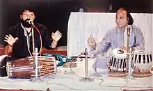 His style draws from several gharanas (stylistic schools) and he accompanied classical musicians and dancers;[2] Talwalkar frequently performed with sarangi player Ram Narayan since the late 1960s, accompanied classical singer Ulhas Kashalkar, and has toured in the United States, Europe, and Africa.[4][5][6] He taught tabla players, including Ramdas Palsule Vijay Ghate, and Western drummers.[2] Talwalkar was awarded the All India Radio Award in 1966, the Sangeet Natak Akademi Award in 2004[2][7] and Padma Shri in 2013.[8]