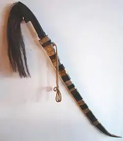 The surik has a single edge blade. The width of the blade narrows from the base down to the tip. Most of the handle is made from horn, and is decorated with tassels to look tough. Goat's hair or horse's hair is attached to the handle. Carving an eye at the center of the handle is meant to strengthen its supernatural power. The sheath of this sword is made of wood.