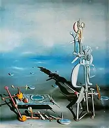 Beside the use of dream analysis, they emphasized that "one could combine inside the same frame, elements not normally found together to produce illogical and startling effects."[21] Breton included the idea of the startling juxtapositions in his 1924 manifesto, taking it in turn from a 1918 essay by poet Pierre Reverdy, which said: "a juxtaposition of two more or less distant realities. The more the relationship between the two juxtaposed realities is distant and true, the stronger the image will be−the greater its emotional power and poetic reality."[22]