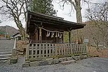 In the Kojiki and the Sendai Kuji Hongi, Takeminakata is portrayed as a son of the god Ōkuninushi who fled to Suwa after his defeat at the hands of the god Takemikazuchi, who was sent by the gods of heaven to claim the land held by his father in the name of the goddess Amaterasu.[3][4][5][6] Other myths (mostly of medieval provenance), however, portray the Suwa deity in a different light. In one story, Suwa Daimyōjin is an interloper who wrested control of Suwa from the indigenous god Moriya,[7] the mythical ancestor of the Moriya (守矢氏) clan, one of the priestly families of the Upper Shrine.[8][9] In another myth, the god is said to have chosen an eight-year-old boy to become his priest (祝, hōri; historical orthography: hafuri) and living incarnation by clothing the latter with his own garments. This boy is eventually said to have become the founding ancestor of the Suwa clan.[10][11][12][13][14]
