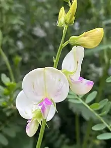 Swainsona sejuncta is a multi-stemmed understory perennial about 1 m (3 ft 3 in) high, 1.5–2 m (4 ft 11 in – 6 ft 7 in) wide and stems slightly angled, mostly 2–3 mm (0.079–0.118 in) wide, smooth, and ribbed. The green leaves are pinnate up to 15 cm (5.9 in) long, 19-31 leaflets, oval-elliptic shaped or narrowly oval, lower leaves smaller, mostly 10–15 mm (0.39–0.59 in) long, 3–5 mm (0.12–0.20 in) wide on a short petiole. The stipule about 3 mm (0.12 in) long, edges thin and dry and almost smooth. The pea-shaped flowers vary in colour, they may be white, orange, yellow, pink or with blotches of pink in racemes 10–15 cm (3.9–5.9 in) long sometimes with 5-10 flowers 15–20 mm (0.59–0.79 in) long on a pedicel up to 5 mm (0.20 in) long and covered in short, soft hairs. The fruit about 30 mm (1.2 in) long, 15 mm (0.59 in) wide, elliptic shaped, swollen, surface initially soft becoming stiff and woody in appearance with age. Flowering usually occurs in spring.[2][3]