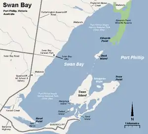 The Swan Bay is a shallow, 30-square-kilometre (12 sq mi) marine embayment at the eastern end of the Bellarine Peninsula in Port Phillip, Victoria, Australia. The township of Queenscliff lies at its southern end, and St Leonards at its northern. It is partly separated from Port Phillip by Swan Island, Duck Island and Edwards Point. Most of the area is included in the Port Phillip Heads Marine National Park as well as being listed as a wetland of international importance under the Ramsar Convention as part of the Port Phillip Bay (Western Shoreline) and Bellarine Peninsula Ramsar Site.[2] The bay is part of the Swan Bay and Port Phillip Bay Islands Important Bird Area, identified as such by BirdLife International because of its importance for orange-bellied parrots, waders and seabirds.[3]