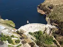 Sweetwater Dam is a concrete thick Arch-gravity dam, straddling the Sweetwater River to form a reservoir capable of holding 28,079 acre-feet (34,635,000 m3) of water.[1] It is 108 feet (33 m) high and 700 feet (210 m) long, with a thickness of 46 feet (14 m) at the base. It is equipped with an intake tower on the upstream end connected to a high-pressure conduit that cuts through the base of the dam designed to release water from different depths of the reservoir; if water is released from a lower elevation the outflow will be greater. However, due to the low flow of the river, there is typically only a trickle of water below the dam as it impounds all the inflow from upstream. Occasional large floods do hit the area, so the dam is designed to survive overtoppings and also has a pair of seven-gated spillways capable of handling more than 45,000 cubic feet per second (1,300 m3/s).[2][3][4]