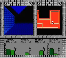 Swords and Serpents can be played by one, two, or four players (by use of the NES Satellite or other 4-player adapter[1]). Control of the characters is divided evenly among the number of players, but one player must be chosen as the party leader to control navigation through the game. Upon starting the game, the player creates a party of four adventurers, choosing one of three available classes for each character: warrior, thief or magician. Warriors have high strength and can have greater defense by wearing heavy armor. Thieves have moderate strength and defense but higher speed and agility compared to warriors, they also have the rare ability to land a critical hit that kills a single enemy regardless of how much health they have left. Wizards have the lowest amount of strength and defense but can cast spells that heal the party, damage enemies and enhance dungeon traversal. Character statistics can be randomly generated, or the player can choose a prefabricated party which includes characters of each class plus another magician. Continuing the game requires the player to record and later input five passwords: one password for each character, and a fifth password for overall game progress.