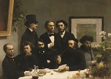 The Symbolist poets have a more complex relationship with Parnassianism, a French literary style that immediately preceded it. While being influenced by hermeticism, allowing freer versification, and rejecting Parnassian clarity and objectivity, it retained Parnassianism's love of word play and concern for the musical qualities of verse. The Symbolists continued to admire Théophile Gautier's motto of "art for art's sake", and retained – and modified – Parnassianism's mood of ironic detachment.[2] Many Symbolist poets, including Stéphane Mallarmé and Paul Verlaine, published early works in Le Parnasse contemporain, the poetry anthologies that gave Parnassianism its name. But Arthur Rimbaud publicly mocked prominent Parnassians and published scatological parodies of some of their main authors, including François Coppée – misattributed to Coppée himself – in L'Album zutique.[3]