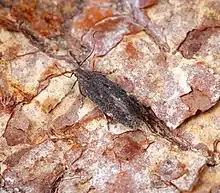 The wingspan is 12–13 mm.[3] The forewings are dark slaty fuscous, slightly purple-tinged; stigmata indistinctly darker, each sometimes followed by two or three ochreous-whitish scales, first discal much beyond plical; a small ochreous-whitish triangular spot, slightly outwardly oblique, on tornus, and another on costa opposite : vein 6 separate. Hindwings are grey. The larva is reddish -brown, anterior incisions whitish-green, dorsal line whitish on 2-4; head yellow-brown; plate of 2 black [4]