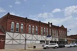 The Syndicate Block is a historic building located in La Porte City, Iowa, United States. A group of real estate investors known as the La Porte Improvement Company was responsible for the construction of this commercial block. The first four sections of the block were completed in 1891, and the fifth section in 1894. It is unknown why its address in 216 Main Street as it is adjacent to 212. It is also the largest commercial building in La Porte City.[2] The investors continued to own and manage the property until 1919. The two-story brick structure features a unified architectural design and late Victorian styling.[2] Brick pilasters surmounted with pinnacles divide each of the units. All of the windows on the second floor are round arched windows. Decorative brickwork is found on the parapet and cornice. A common entrance to the second floor units is found between 210 and 212. The cornice at this point has a stone name plaque that reads "Syndicate/Block/1891." Above 216 is a triangular pediment. While some of the storefronts have been altered the upper floor maintains its integrity. It was listed on the National Register of Historic Places in 2005.[1]
