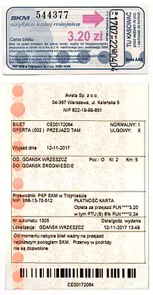 The layout of the ticket has changed with time. At first, tickets were identical on all local lines, and were small cardboard rectangles, often with a hole pierced in the middle. Tickets then became orange, with a white stripe on one end for stamping information about the station and time of validation. The SKM then moved to light blue tickets, also with a white stripe which were only valid on its lines. Originally, this new layout had a list of stops printed on the reverse. Recently, this has been replaced by advertisements or information about the possibility of advertising. There are also blank tickets, sold by train conductors to sell tickets at stops where no ticket office is available. These have a list of stops with boxes to note start and destination of the journey, type of discount (if any) and number of tickets. An extra fee for sale on the train can also be noted on these tickets, for instance, if a passenger boards at a stop where he could buy a ticket normally.