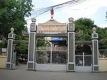 The Triple Gate (Tam Quan) is accessible by both pedestrians and vehicles. Two-wheeled vehicles and pedestrians use the left and right wings respectively, and cars, buses, and trucks can use the central wing. The three gates represent emptiness, impermanence and middle-view.[8] It is decorated with sculptures and engravings of lotuses, lanterns and swastikas, all prominent symbols in Buddhism.[9] On the left hand side of the grounds, there is a Bodhi tree, a symbol of the enlightenment of the Buddha. The tree is located in a concrete lotus, and around it are eight samsara-wheel-shaped signs that represent the Noble Eightfold Path. Signs with text explain each of the eight paths.[9]