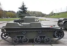 Like other light tanks of its time, the T-38 was designed for reconnaissance and infantry support roles. As a scout tank the T-38 had the advantages of a very low silhouette and good long-range mobility through its ability to swim. The T-38 was also intended to be air-portable; during the Kiev maneuvers in 1936, the tanks were transported by Tupolev TB-3 bombers, mounted under the fuselage.[3] Infantry battalions were each issued 38 T-38s, with 50 being designated for each airborne armored battalions. However, the thin armor and single machinegun armament made the tank of only limited use in combat and the lack of a radio in most T-38s was a serious limitation for a reconnaissance vehicle. The T-38 also struggled with carrying any excess cargo across water. The tank was incapable of supporting the weight of two infantrymen while floating, and overloads of 120-150 kilos would cause the commander's hatch to flood, sinking the vehicle.[1] These flaws were to be fixed by the T-38's successor, the T-40, but only a small number were built before the outbreak of World War II, leaving the T-37A and T-38 to form the bulk of the Red Army's amphibious tanks.[4]