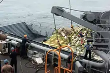 Search and recovery operations were conducted by federal, state, and local agencies, as well as government contractors.[1]: 363–365 An HH-60 Pave Hawk helicopter of the New York Air National Guard saw the explosion from about 8 miles away; it arrived at the scene of the explosion while debris was still in the process of falling into the water, forcing the crew to pull away. They reported their sighting to the tower at Suffolk County Airport. Remotely operated vehicles (ROVs), side-scan sonar, and laser line-scanning equipment were used to search for and investigate underwater debris fields. Victims and wreckage were recovered by scuba divers and ROVs; later scallop trawlers were used to recover wreckage embedded in the sea floor.[1]: 63 In one of the largest diver-assisted salvage operations ever conducted, often working in very difficult and dangerous conditions, over 95% of the airplane wreckage was eventually recovered.[29][30]: 1 The search and recovery effort identified three main areas of wreckage underwater;[1]: 65 the yellow zone, red zone, and green zone contained wreckage from front, center, and rear sections of the airplane, respectively.[1]: 65–74 The green zone with the aft portion of the aircraft was located the furthest along the flight path.[1]: 71–74