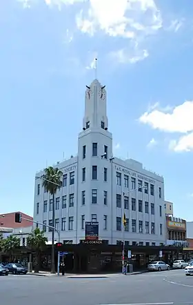 The T & G Building is a distinctive building in Geelong, Victoria, Australia. It is located on the corner of Moorabool and Ryrie Streets. The building's style is a blend of Art Deco and Classicism. Both of these styles can be noted in the buildings geometric grooves, vertical lines and stepped form. The exterior of the ground floor features chevron grill patterns, a feature that is particular of Art Deco archicture.