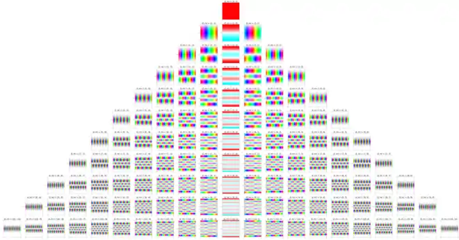 Below the complex spherical harmonics are represented on 2D plots with the azimuthal angle, , on the horizontal axis and the polar angle, , on the vertical axis. The saturation of the color at any point represents the magnitude of the spherical harmonic and the hue represents the phase.
