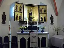 The original altar, depicting Mary(am) of Nazareth, was translated in 1924 to St. Nicholas' Church in Berlin's central borough of Mitte and is now exhibited in the Märkisches Museum. In the same year Tabor Church received in return a wooden altar (of the last quarter of the 15th century) from the village church in Berlin-Wartenberg, showing the carved sculptures of Mary(am) of Nazareth with the infant Jesus in the central field, flanked by two bipartite folding flaps with sculptures of Saints. The pulpit dates to the early 17th century and is decorated with diamond-styled Herms pilasters.
