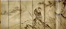 In Japan, records indicate that falconry from Continental Asia began in the fourth century.[1] According to a passage in the Nihon Shoki (720), continental falconry was introduced by the Baekje noble Sakenokimi in 359 during the reign of Emperor Nintoku.[2] From the outset, the central Court and local lords both enjoyed hawking, with the former trying to monopolize falconry, sometimes with banning orders. Central power, however, as seen in the repetition of prohibiting orders, had no complete control over local falconry until the 17th century. In the 13th century, hawking became popular among the rising samurai class as well as among court nobles (kuge). At that time, the practice of hawking was a means of resolving struggles over land ownership among lords. Buddhist temples, who were also land owners, opposed falconry based on their ideology against killing. Falconer lords, on the other hand, devised a Buddhist rationale or resorted to Shinto justifications. Several falconry schools or styles (ryū) were formed in the process.