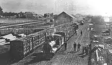 Edmund Allan and Samuel[14] Kingstreet[15] had a £14,100 contract to build the 14 mi (23 km) extension of the Napier to Waipukurau railway south to Takapau.[16] They built a 5th class station in 1875 and Donald McLeod, a Waipukurau carpenter,[17] built a goods shed and platform in 1877. Initially, only one train a day ran from Takapau.[18] In 1890 there were two trains a day.[19] There was a post office at the station from 1887 to 1911. By 1896 there were 30 ft (9.1 m) x 20 ft (6.1 m) and 40 ft (12 m) x 30 ft (9.1 m) goods sheds and also a cart approach, loading bank, cattle yards, stationmaster's house, urinals and a passing loop for 24 wagons, extended to 55 in 1911 and further extended in 1940. In 1905 a verandah was added and the platform extended. Electric lights were installed in 1921. Railway houses were built in 1928 and 1946.[11]