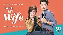 Take My Wife is an American sitcom on the Seeso comedy subscription streaming service. The show follows former real-life couple Cameron Esposito and River Butcher (credited as Rhea Butcher) as they share their lives as stand-up comics who are balancing work, relationships, and the breaking down of gender barriers.[1] On December 19, 2016, Seeso renewed the series for a second season.[2] On August 9, 2017, Seeso announced the shutdown of its service by the end of the year, leaving Take My Wife without a home. On March 5, 2018, it was announced that season 1 and the previously unaired season 2 were now available on iTunes (US) and would be available on the Starz app starting May 1, 2018. Take My Wife is also now available on iTunes in the UK (as of April 30, 2018).[3]