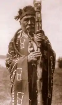 In the Northwest Coast, talking sticks are carved wooden staffs, which can either bear a single crest at the top or be fully carved with heraldic clan crests of the chief or hereditary political spokesman.[1] The staffs can include shell inlay.[2] The staffs resemble small totem poles and are still used ceremonially today.[3] At gatherings, especially potlatches, a chief or his designated speaker holds the talking stick and publicly announces message.[3][4] The speaker thumps the stick on the ground for emphasis.[3] A feather has been used as a stand-in for the talking stick.[5]