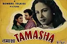 Tamasha is a 1952 Indian Hindi-language romantic comedy film directed by Phani Mazumdar, starring Meena Kumari, Dev Anand and Ashok Kumar. One of the big hits of the year from Bombay Talkies produced by Ashok Kumar and Savak Vacha, "Tamasha" had a narrative far ahead of its times, its action spread over 16 eventful days. This movie is a copy of the Hollywood movie It Started with Eve[1]