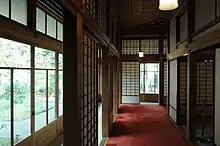 The villa is one of the largest wooden buildings of Japan and counts 106 rooms, most of which were used by the imperial court. The interior is a blend of Japanese and Western design, mixing carpet floor, chandeliers with sliding doors as well as tatami flooring. The villa is surrounded by a large park, currently only one quarter of what it was in its heyday.