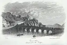 During the Middle Ages, the settlement then known as Llanteulyddog ('St Teulyddog's)[11] accounted one of the seven principal sees (Cantrefi) in Dyfed.[12] The strategic importance of Carmarthen caused the Norman William fitz Baldwin to build a castle there, probably about 1094. The current castle site is known to have been occupied since 1105. The castle itself was destroyed by Llywelyn the Great in 1215, but rebuilt in 1223, when permission was given for a town wall and crenellations, making it one of the first medieval walled towns in Wales. In 1405, the town was captured and the castle sacked by Owain Glyndŵr. The Black Book of Carmarthen of about 1250 is associated with the town's Priory of SS John the Evangelist and Teulyddog.