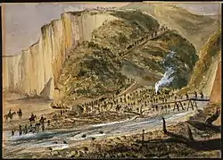 ![]() 1865 painting of soldiers crossing the river at the beach during the Second Taranaki War | |