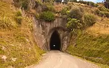 Tangahoe Valley Tunnel runs under the ridge separating Pukekino Rd (leading to Lake Rotorangi) from the Tangahoe Valley.[20] The 160 m (520 ft) tunnel was built in 1928.[21] Digging was from both ends and didn't quite meet in the middle, hence a variation in the roof height in the centre.[22]