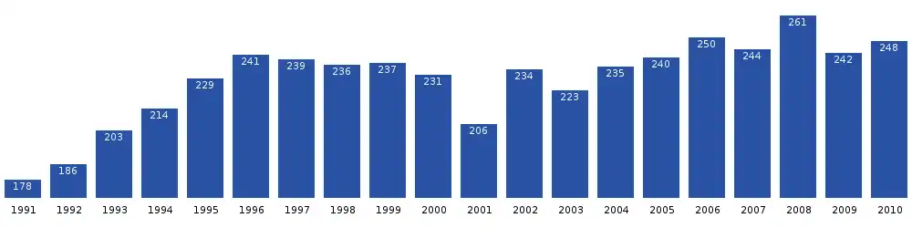 Tasiusaq is one of the few settlements in the Avannaata municipality exhibiting significant growth patterns over the course of the last two decades, increasing by nearly half relative to the 1990 levels and by over 7 percent relative to the 2000 levels.[4]
