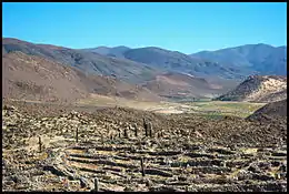 Located around 2.5 km (1.5 mi) northwest of the settlement are the Ruins of Tastil. Built by the Atacameño people, Tastil thrived during the 15th century, and grew to perhaps 400 households and over 2,000 inhabitants prior to a siege by the invading troops of the Inca Empire. Subsisting on quinoa, maize, and llama husbandry, the Tastileños built their community out of sandstone, and without the use of mortar. The labyrinthine layout of Tastil included catacombs and plazas, and the central square was built around a wanka (a sacred stone).[1]