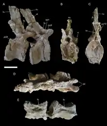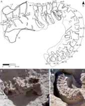 The first known elements of the holotype were discovered in the Aïn el Guettar Formation in 2011 by Aldo Luigi Bacchetta, but he was unable to excavate the specimen until 2012. The remains were subsequently studied by Federico Fanti, Andrea Cau, Mohsen Hassine and Michela Contessi. The genus was named in 2013[2] and in 2015, more material of the holotype specimen was uncovered after the initial description were analysed.[3] These included additional tail vertebrae.