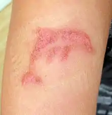 Tattoo inks have been described as "remarkably nonreactive histologically".[90] However, cases of allergic reactions to tattoo inks, particularly certain colors, have been medically documented. This is sometimes due to the presence of nickel in an ink pigment, which triggers a common metal allergy. Occasionally, when a blood vessel is punctured during the tattooing procedure, a bruise/hematoma may appear. At the same time, a number of tattoo inks may contain hazardous substances, and a proposal has been submitted by the European Chemicals Agency (ECHA) to restrict the intentional use or concentration limit of approximately 4 000 substances when contained in tattoo inks.[121] According to a study by the European Union Observatory for Nanomaterials (EUON), a number of modern-day tattoo inks contain nanomaterials.[122] These engender significant nanotoxicological concerns.